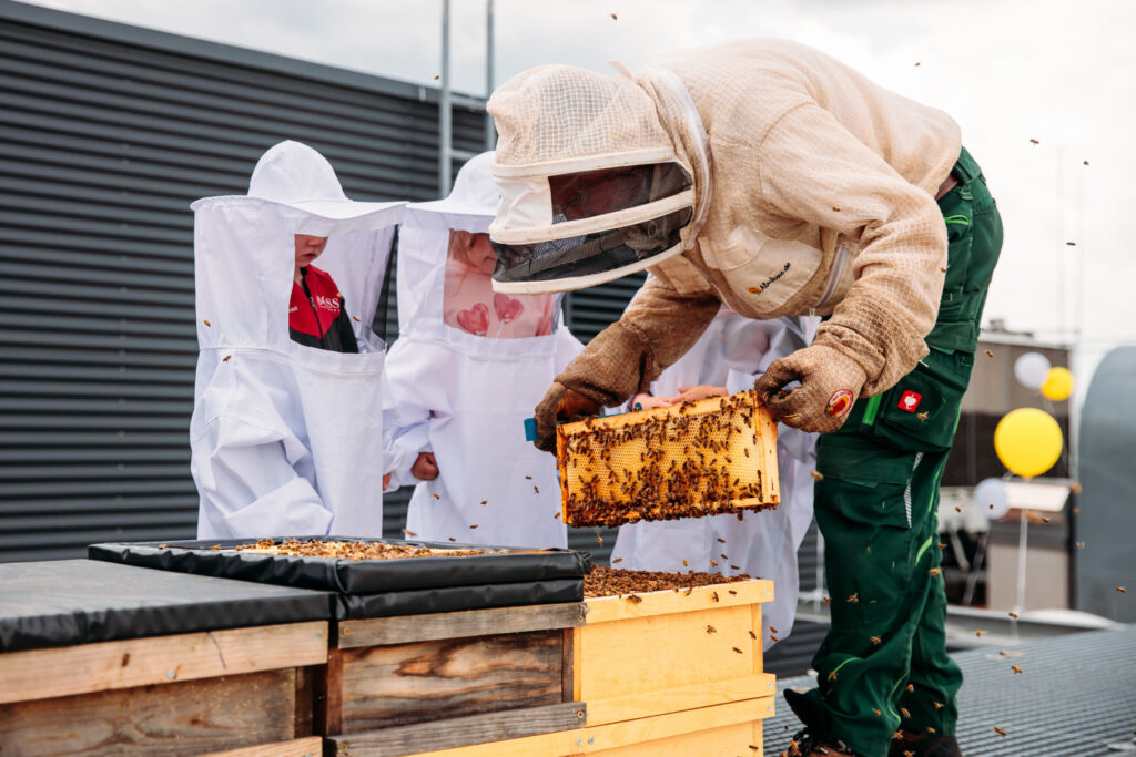 Für das Beezdorf-Projekt werden insgesamt 6 Bienenvölker auf dem Dach des Aesculap Centers aufgestellt. Die Honigbienen werden dabei von geschulten Imkern betreut und sind in der Umgebung auf Futtersuche. Mit dem Projekt unterstützen wir nicht nur die Bienen, sondern die gesamte lokale Biodiversität und Artenvielfalt in einem Radius von bis zu fünf Kilometern um das Center.